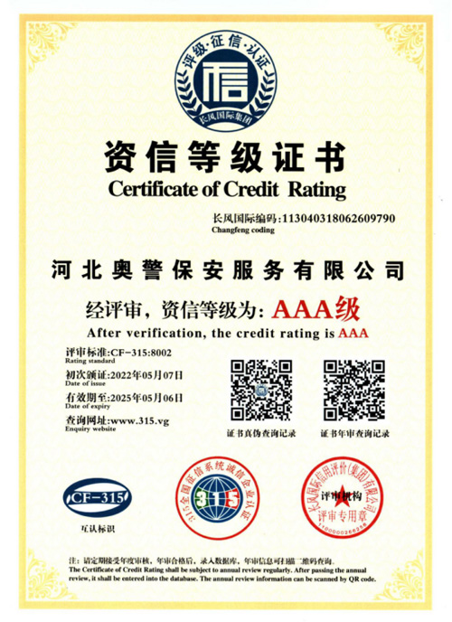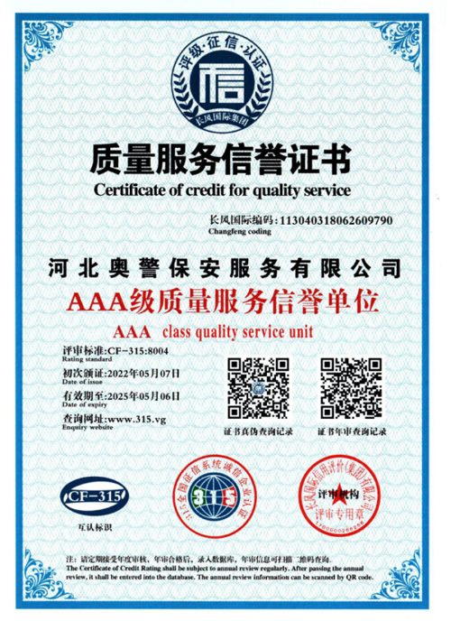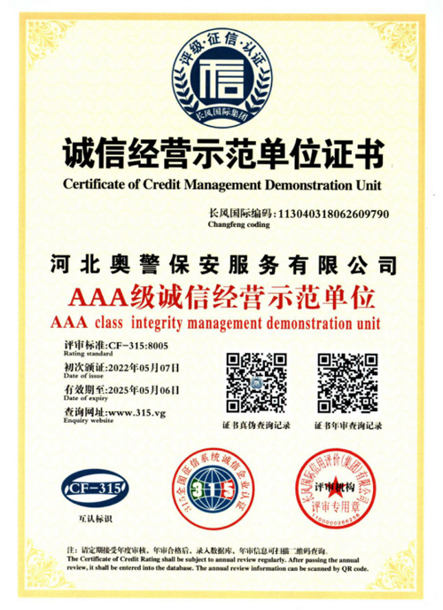 河北奧警保安服務有限公司河北奧警保安服務有限公司成立于2017年7月20日,注冊資金1000萬元,具有中華人民共和國《保安服務許可證》(編號:冀公保服20180085)的綜合性安保企業(yè)。